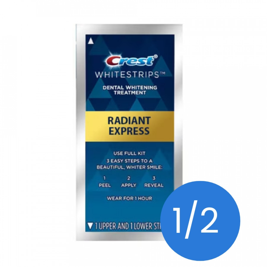 Crest 3D White RADIANT EXPRESS fogfehérítő matricák féladagos csomagolása. Ennél a féladagos változatnál természetesen a matricák nincsenek dobozban, mivel csak a teljes csomagolás feléről van szó. Az alkalmazások egyes tasakjai egy ZIP-tasakban van elhelyezve. A teljes csomagolás professzionális szintű fogfehérítést biztosít. Természetesen a féladagos csomagolás esetében figyelembe kell venni, hogy ez nem a professzionális fehérítő hatásra szánt teljes csomagolás, de a legtöbb vásárló számára még az ilyen féladagos megoldások is elegendők a jelentős fehérítő hatás eléréséhez.