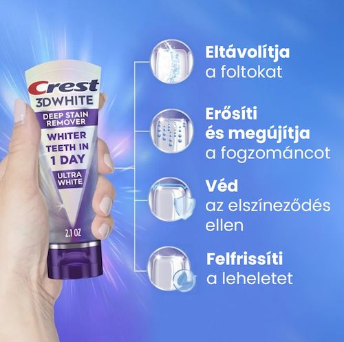 A Crest 3D White Brilliance Deep Stain Remover fogfehérítő fogkrém valóban látható eredményeket nyújt – pusztán fogkrém használatával is. Már egy nap alatt felbontja a makacs, mélyen ülő elszíneződések kötéseit, és minden oldalról láthatóan fehérebb fogakat biztosít.