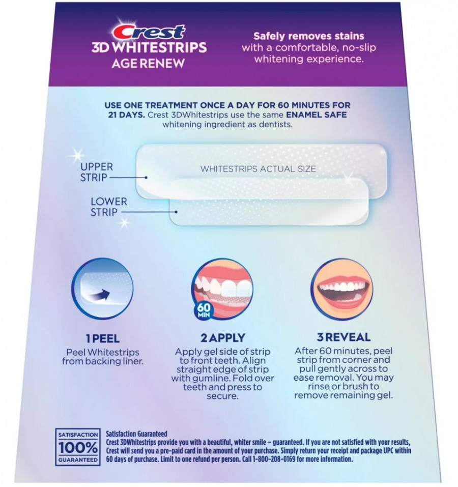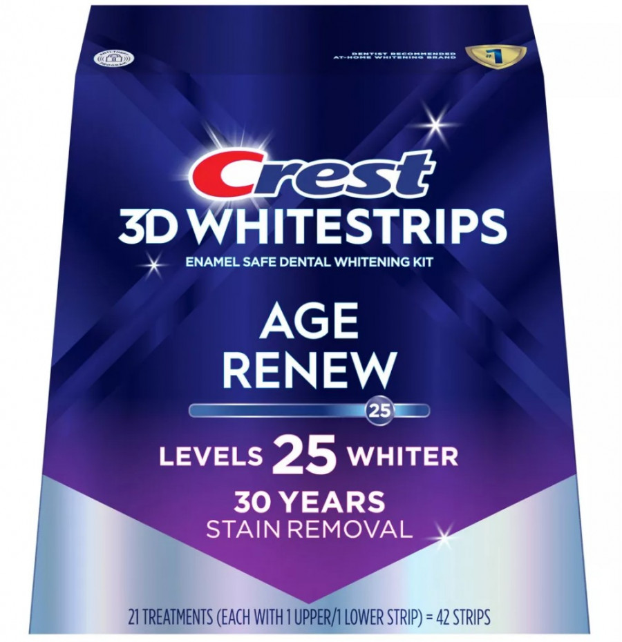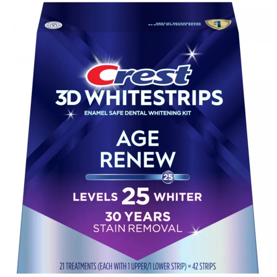 A Crest 3D Whitestrips AGE RENEW fogfehérítő matricák a Professional White + LED Light és a Supreme tapaszokkal a Crest kínálatának a leghatékonyabb tapaszai. A gyártó állítása szerint és az elvégzett vizsgálatok alapján akár 25 év foglerakódásait is eltávolítják. A tapaszok segítségével a fogfehérítő hatás legmagasabb szintjét éri el. Az említett leghatékonyabb termékek a fogérzékenységben szenvedő emberek számára nem alkalmasak, ugyanis számukra kellemetlen lehet a tapaszok egyórás alkalmazása.