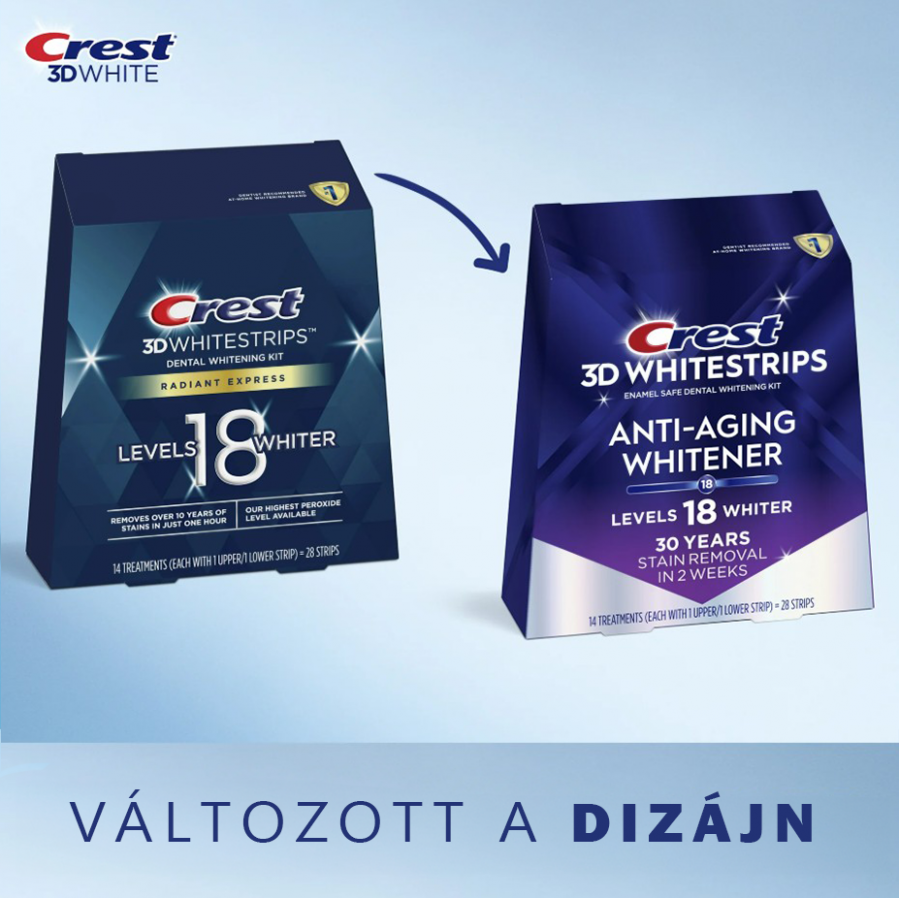 A Crest 3D White RADIANT EXPRESS fehérítő csíkok utódja. Az új Crest 3D Whitestrips ANTI-AGING WHITENER csíkok akár 30 éves elszíneződéseket is hatékonyan eltávolítanak a fogakról, mindössze két hét használat után. Fehérebb fogak otthoni kényelemben az évek óta bevált amerikai Crest márkának köszönhetően.