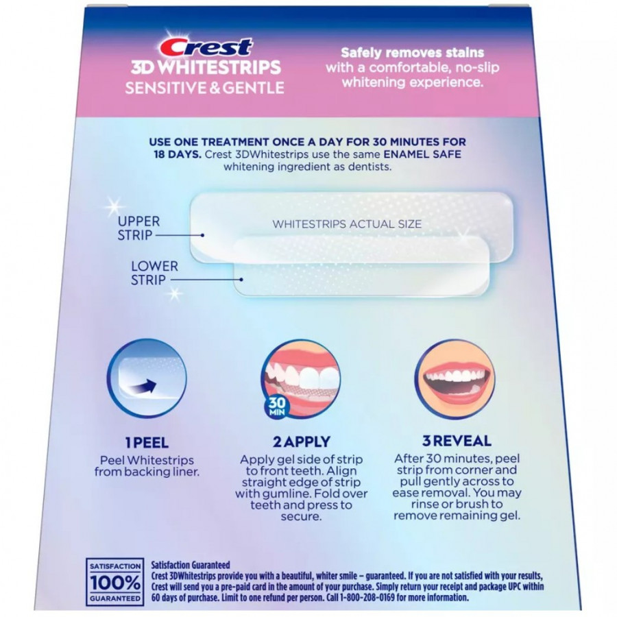 Crest Whitestrips SENSITIVE & GENTLE fehérítő matricákat kifejezetten érzékeny fogakra vagy az érzékeny fognyakra fejlesztették ki. A fehérítés fokozatos és nagyon kíméletes, de hatékony. Ezek a matricák eltávolíthatják a fogak elszíneződését, amely akár 15 éves. A fogak fehérek és ragyogóak az előírt használat után.